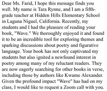 ”Farid’s poetry rides the page like a wave, charting the ups and downs of Ava’s emotions. . .The verse format makes this text extremely accessible, and readers will be delighted to find elements of Ava’s Persian heritage and 1980s childhood also woven throughout.“